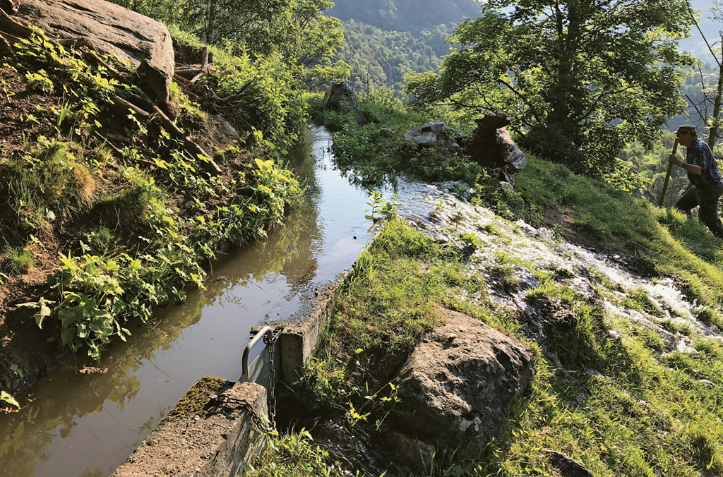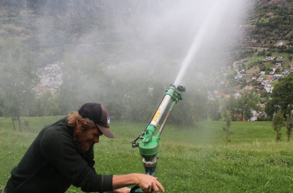 David Müller, der zusammen mit seiner Partnerin Piera Sutter seit drei Jahren den Biohof Schmeli oberhalb von Brig bewirtschaftet, bewässert sowohl mit der Hangbewässerung als auch mit Sprinkleranlagen. Der Grund für diese Zweigleisigkeit ist pragmatisch: Auf landwirtschaftlichem Land sind feste Sprinkleranlagen installiert, auf Bauland betreiben die Landwirtinnen und Landwirte in Brig weiterhin Hangbewässerung.