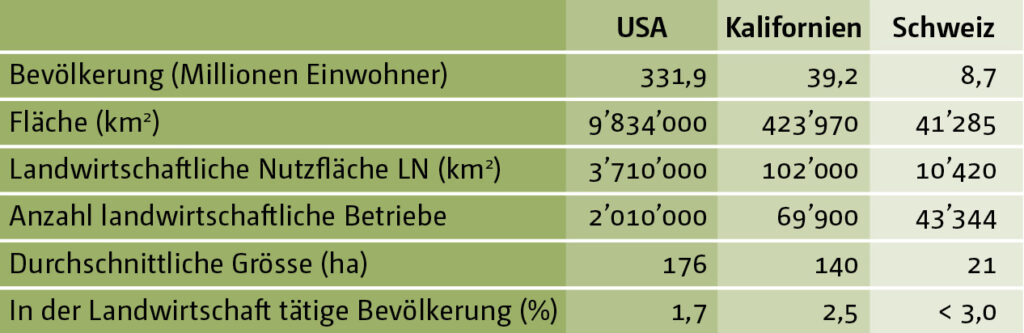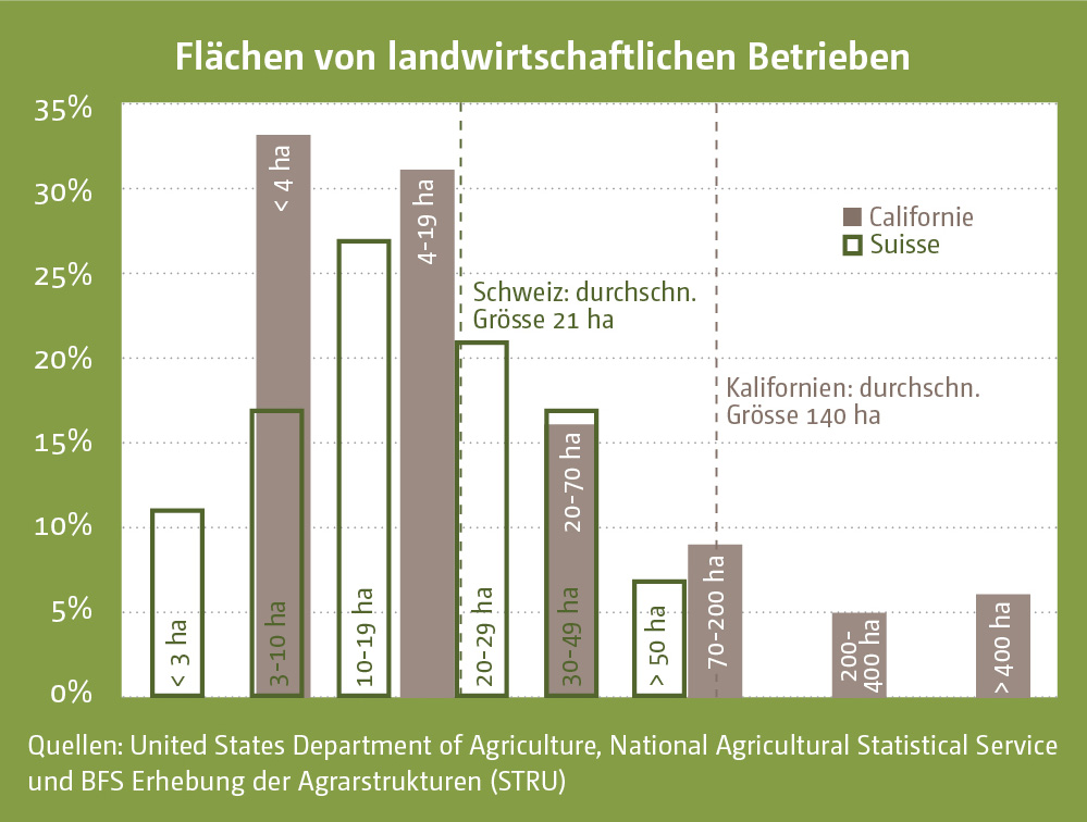 Die Anzahl der landwirtschaftlichen Betriebe in Kalifornien nimmt ab, während ihre Grösse zunimmt (um jeweils -20 % und +6 % von 1997 bis 2017). Die durchschnittliche Betriebsgrösse beträgt 140 Hektar, allerdings bewirtschaften vier von fünf Betrieben weniger als 70 Hektar, und ein Drittel weniger als vier Hektar. Sowohl die verfügbare Infrastruktur als auch die komplexe Gesetzgebung sind auf Betriebe ausgelegt worden, die dem industriellen Massstab entsprechen. Die Vielfalt der kleinen Betriebe wird nicht berücksichtigt. Trotz ihrer grossen Anzahl sind sie politisch schlecht vertreten und in vielerlei Hinsicht benachteiligt.