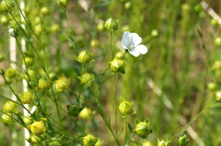 Der ‘Weisse Faserlein Ballenberg’ aus Brünigen bei Meiringen (BE) stammt von einer Leinenweberin, die aus eigenem Anbau Leinen herstellte. Lein lieferte schon vor 6000 Jahren nicht nur wertvolle Nahrung, sondern auch Fasern für die Kleiderherstellung. Später wurde er von Baumwolle und Synthetik verdrängt. -
