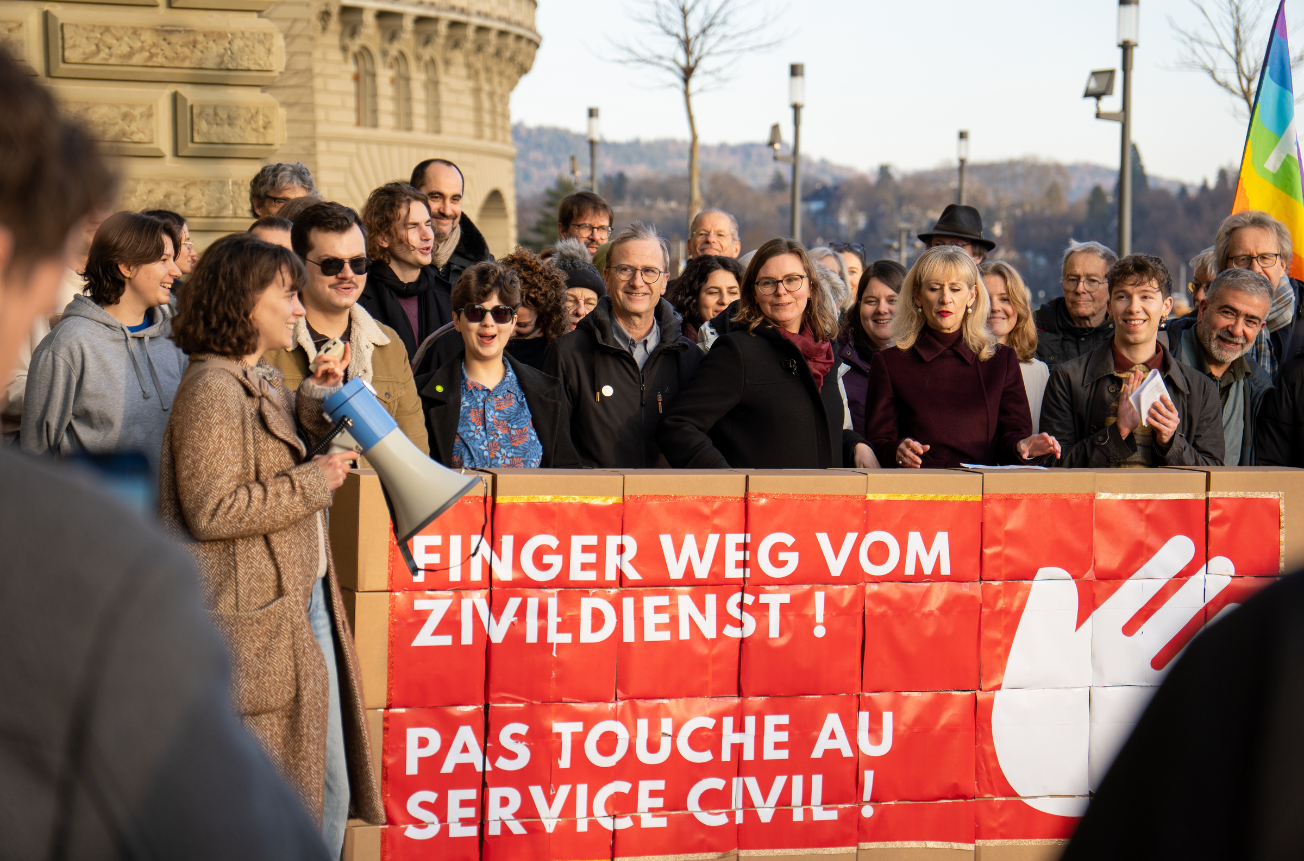 Der erste Schritt ist geschafft: Als Teil einer breiten Allianz haben wir heute das Referendum gegen das Zivildienstgesetz eingereicht. Damit wehren wir uns dagegen, dass künftig 40 Prozent weniger Zivildienstleistende zugelassen werden. Dank euerer Mithilfe konnten wir der Bundeskanzlei heute 57’777 Unterschriften übergeben, womit nun das Schweizer Stimmvolk den Letztentscheid hat. Die Volksabstimmung über das Zivildienstgesetz findet voraussichtlich am 14. Juni 2026 statt.